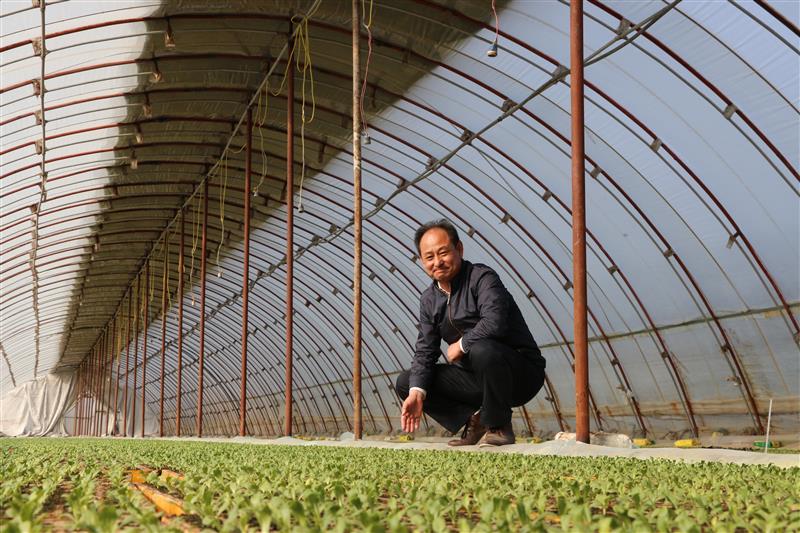 韓寶林在基地育苗大棚查看苗情。這樣一個(gè)一畝面積的大棚,一次育出的菜苗可以栽種50畝露地菜。