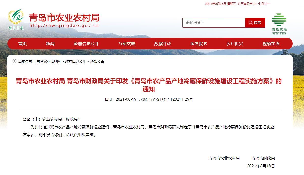 預(yù)冷及配套設(shè)施設(shè)備。根據(jù)產(chǎn)品特性、市場發(fā)展和儲(chǔ)運(yùn)加工的實(shí)際需要,規(guī)模較大的設(shè)施,可配套建設(shè)強(qiáng)制通風(fēng)預(yù)冷、差壓預(yù)冷或真空預(yù)冷等預(yù)冷庫或預(yù)冷設(shè)施,配備必要的稱量、清洗、分級(jí)、檢測、信息采集等設(shè)備以及新建貯藏設(shè)施專用的供配電設(shè)備。農(nóng)產(chǎn)品產(chǎn)地冷藏保鮮設(shè)施建設(shè)規(guī)模在500噸以上的,要將信息采集監(jiān)測傳輸視頻設(shè)備與青島市農(nóng)業(yè)農(nóng)村大數(shù)據(jù)平臺(tái)互聯(lián)互通。