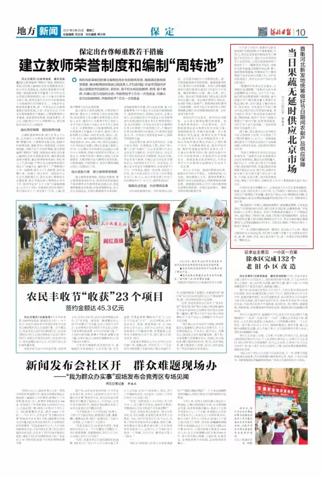 9月29日,河北日報第十版地方新聞板塊刊登題為“首衡河北新發地統籌做好節日期間農副產品供應保障 當日果蔬無延時供應北京市場”文章,報道首衡河北新發地著力保障北京節日食品供應。