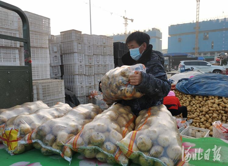 與冬瓜交易區(qū)相鄰的土豆交易區(qū)也是同樣繁忙,有分揀、裝袋的,有裝車運出的,還不時有產(chǎn)地的物流車進來補給銷售。“我在內(nèi)蒙古錫林浩特太仆寺旗有土豆種植基地2000畝,那里的存儲庫目前有1萬噸土豆,可隨時根據(jù)這邊需求發(fā)貨。”土豆經(jīng)營戶徐長軍介紹:“像億客隆、京客隆等連鎖商超都是我的客戶。”