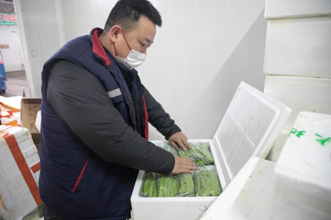 洪峰商貿的負責人李洪峰正在組織產品入庫,“這是剛才廣州產地運輸過來的菜心,最近像菜心、芥藍、香蔥等產品賣得比較好,每天銷售2000多件。”李洪峰介紹,“我們不能歇,像東三省、內蒙、山西等地下游客戶的訂單都排滿了,一直到年底了,我是吉林人,也不回老家了,就地過年保證供貨了。”