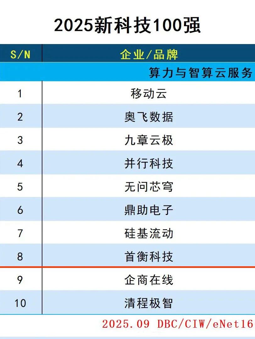 9月23日,中國科學(xué)院《互聯(lián)網(wǎng)周刊》、德本咨詢與eNet 研究院聯(lián)合揭曉“2025 年中國新科技 100 強(qiáng)企業(yè)”榜單。在“算力與智算云服務(wù)”這一賽道中,僅有 10 家企業(yè)成功入選,首衡科技憑借在智算基礎(chǔ)設(shè)施、產(chǎn)業(yè)級 AI 融合與智能化應(yīng)用上的突破性成就,躋身 TOP10 行列。
